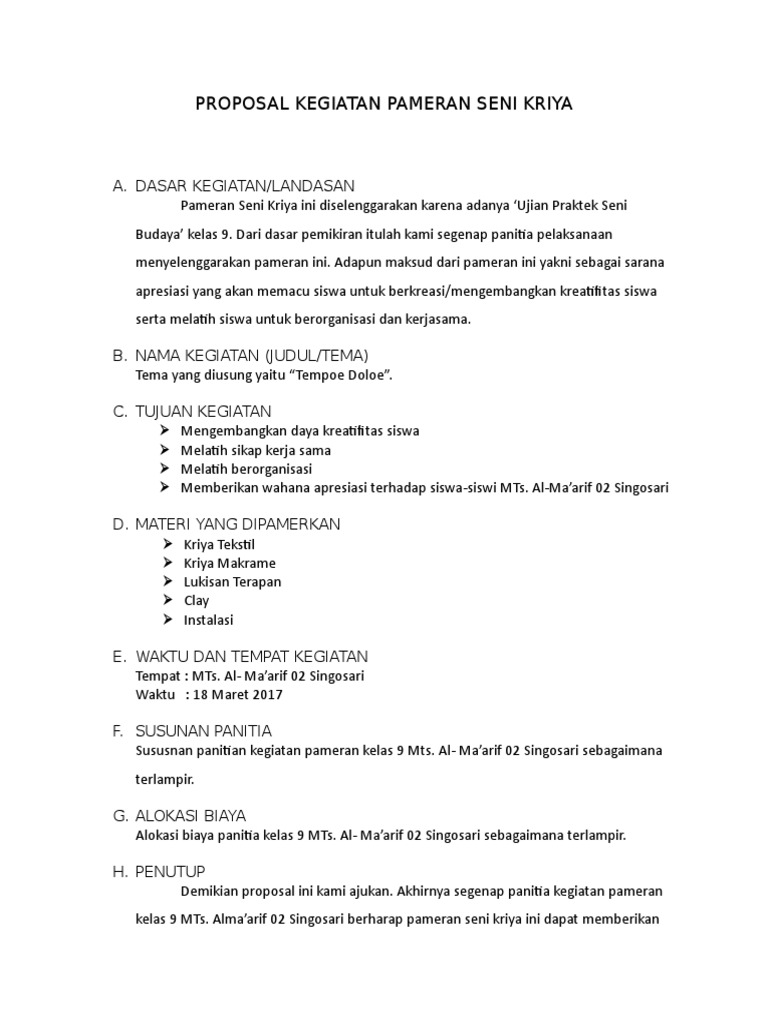 Gaji seluruh anggota Rp. Contoh proposal kegiatan yang sering dinuat yang mana tidak hanya dikalangan organisasi saja namun dilingkungan sekolah dan kampus. Kali ini saya akan memberikan contoh PROPOSAL PAMERAN KERAJINAN TANGAN.