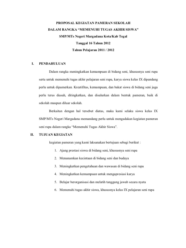 CONTOH PROPOSAL KEGIATAN PAMERAN SENI RU 1 dipamerkan kreativitas kemampuan dan bakat siswa dibidang seni dan juga perlu terus diasah ditingkatkan dan disalurkan dalam bentuk pameran. PROPOSAL KEGIATAN PAMERAN SENI LUKIS DUA DIMENSI. DIMAS ARYA PRADANA 2 KATA PENGANTAR.