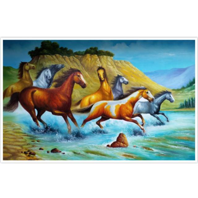 Jual lukisan kuda lari ke kiri. Lukisan Kuda 8 050520 Produk Gambar Kuda Fengshui. Lukisan Pemandangan Sungai di Desa Balchi Bara.